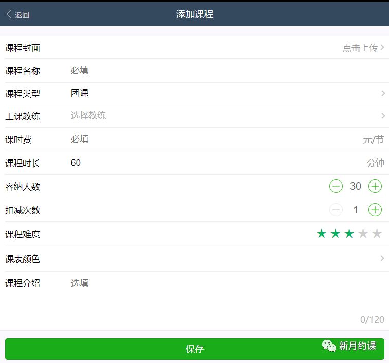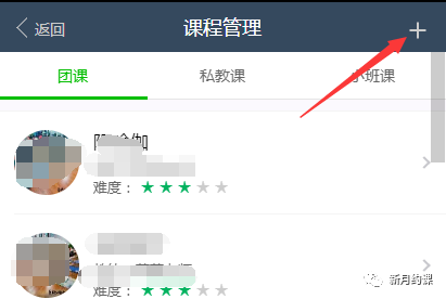 3. 添加课程。 点击-课程,右上角点击“+”号,输入课程名称,选择课程类型,上传课程照片(可选),选择课程教练,等等其他信息,保存。