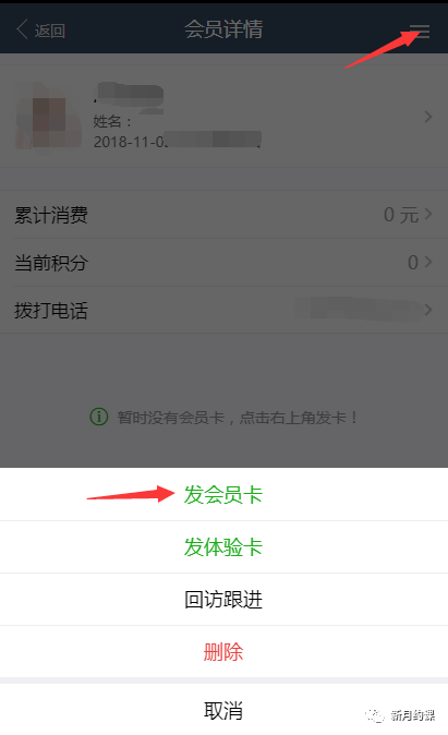 6.会员发卡。管理-访客管理,点击学员头像,进会员信息页面,点击右上角菜单,选择发卡,选择会员卡,如果是老会员,已经使用了一段时间,需要更改激活方式,选择指定日期激活,日期就是之前的发卡日期,这样老用户的剩余时间还是不变的,如果是次卡,输入剩余次数。